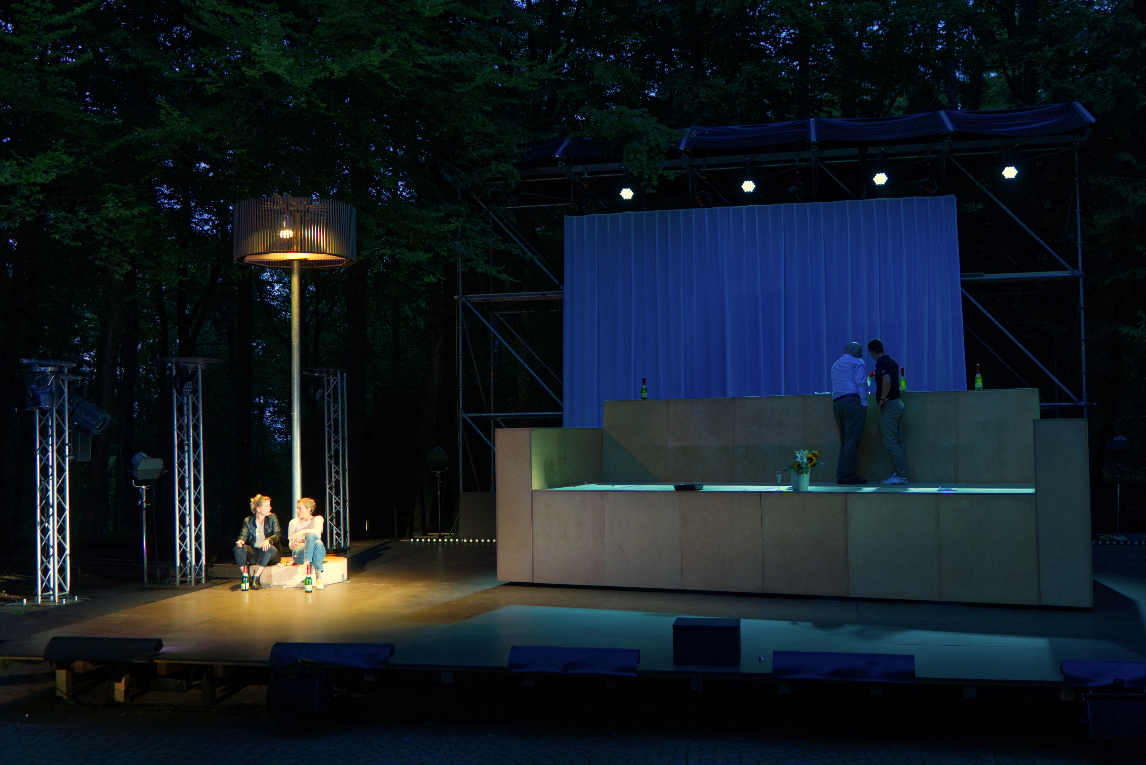 Lighting design for the world premiere of Sören Hornung’s play Die Legende von Sorge und Elend, directed by Janek Liebetruth, at the Theaternatur Festival. The set is by Hannes Hartmann, the clothes are by Leah Lichtwitz, and the video is by Lucian Patermann. It performed at the Waldbühne Benneckenstein.